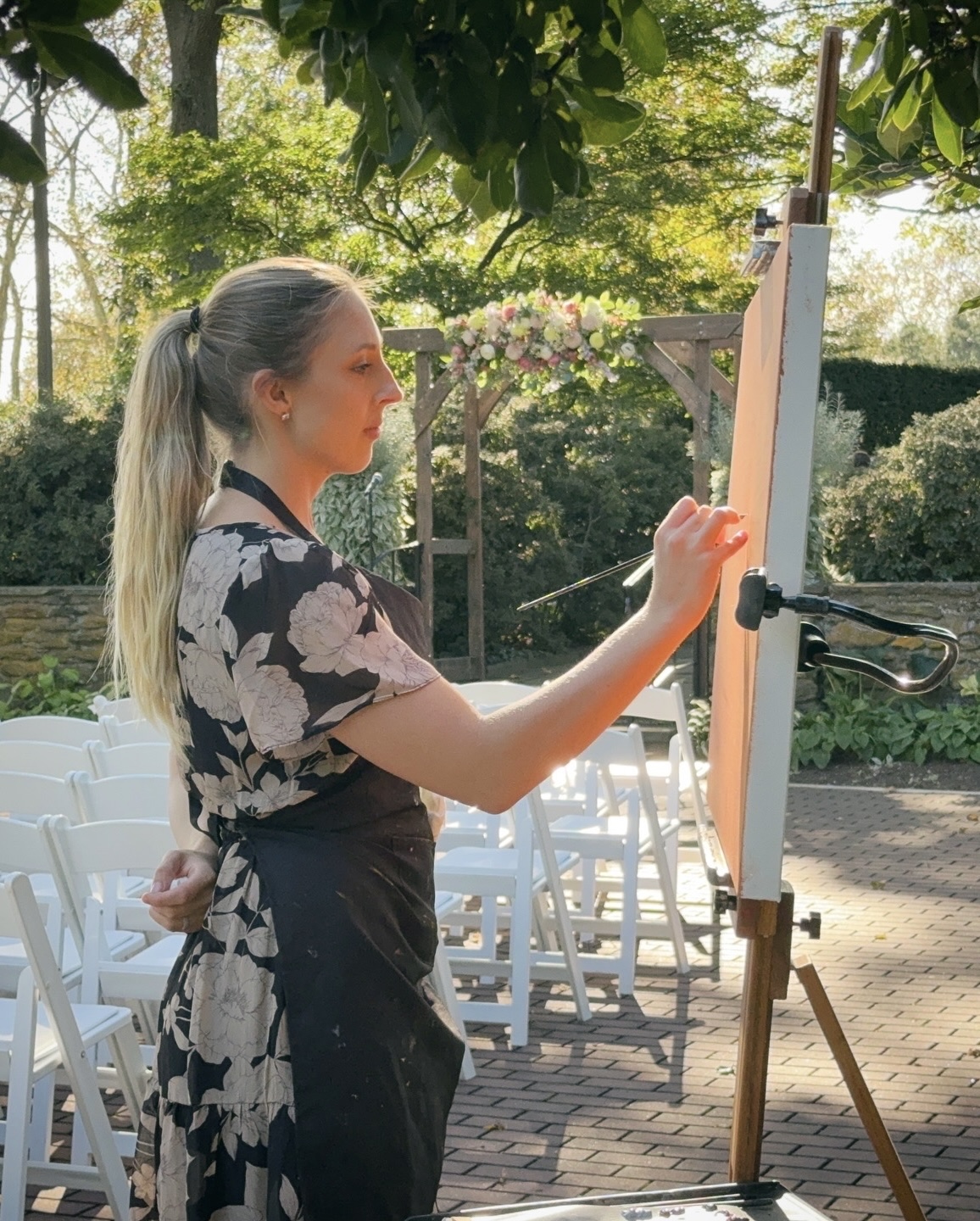 Live painting captures the feeling of the day in a way photography and digital editing cannot. The artist can place people into the painting aesthetically, even if they aren't physically there, and focus the piece on the bride and groom. The artist can also change certain features in the background (i.e. make the leaves more autumn-colored, make the room brighter, make the sky more clear/sunny, etc). Live painting is also entertaining and exciting for guests to observe!